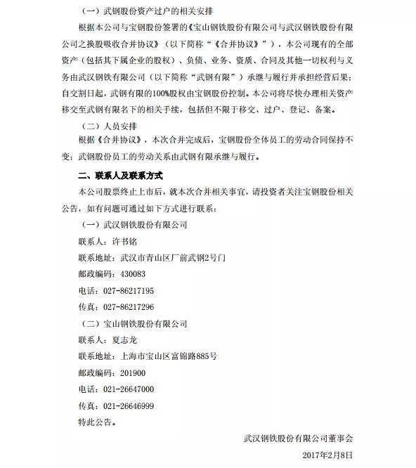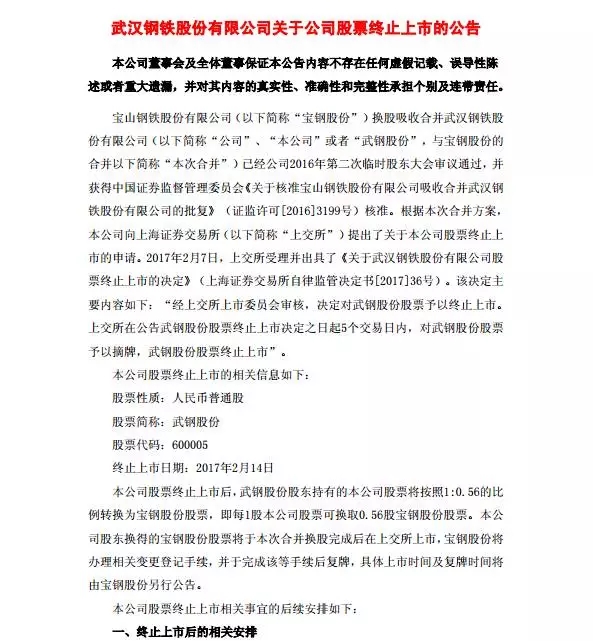 2月8日,武钢股份发布公告称,上交所受理并出具了《关于武汉钢铁股份有限公司股票终止上市的决定》:“经上交所上市委员会审核,决定对武钢股份股票予以终止上市。上交所在公告武钢股份股票终止上市决定之日起5个交易日内,对武钢股份股票予以摘牌,武钢股份股票终止上市”。