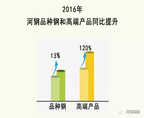 2016年,河钢的品种钢比例达到54%,同比提高13个百分点;高端产品同比提升120%,汽车板、家电板、管线钢、海洋用钢等高端产品全年销量达到1200万吨。
