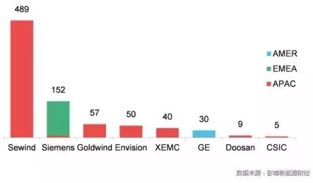 2016年全球海上风电整机商排名中,上海电气以489MW新增装机量排在第一位,西门子排在第二位,金风科技排在第三位。中国整机商进入前十的有5家,分别为上海电气(1)、金风科技(3)、远景能源(4)、湘电风能(5)、海装风电(8)。