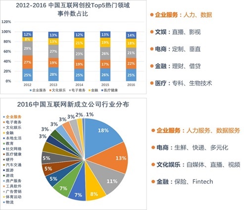 2012-2016 中国互联网创投Top5热门领域事件数占比,及2016中国互联网新成立公司行业分布。数据来源于itjuzi.com