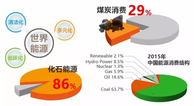 2015年我国经济总量占世界的15.5%,一次能源消费总量约占全球的23%(化石能源占一次能源消费比例88%),单位GDP能耗是世界平均的1.5倍,碳排放量占全球总量1/4,新能源、可再生能源发展仍面临成本问题。中国煤炭消费峰值会很快或已经到来,但在未来相当长时期内仍将是中国能源消费绝对主力,煤炭清洁发展的重要性日益凸显。
