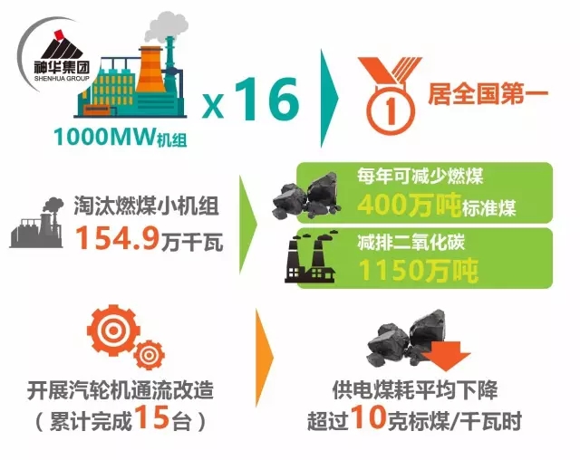 神华1000MW机组已投运16台,居全国第一,带动供电煤耗和碳排放强度持续下降。