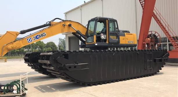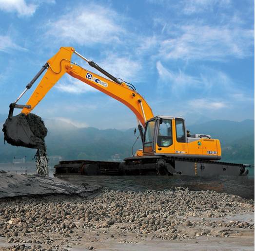 徐工XE215S水陆两栖挖掘机是在XE215C成熟技术基础上,针对滩土特点、气候环境进行研发设计,除具有一般挖掘机的功能外,还具有接地比压低、水上浮航的特点,适用于陆地、沼泽软地面及淤泥及水面安全行走与作业的新型多用途挖掘机。该机器采用了自有的优化动力、液压系统和电气系统,作业效率和可靠性更高;新型密封式浮箱履带行走结构,克服了水陆两用液压挖掘机行走系统易磨损、寿命短、阻力大、功耗高的不足;在维护保养、专场转运和工况通用性方面具有较强的市场竞争力。