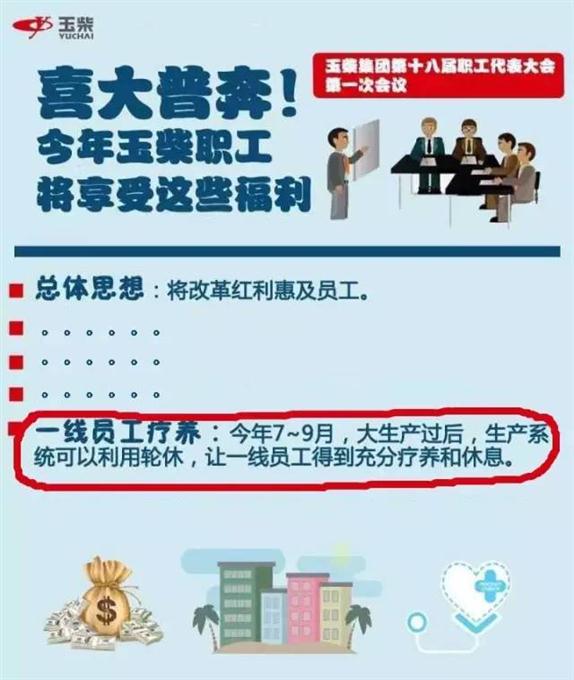 为了感谢一线员工的辛勤付出,在今年3月24日召开的玉柴集团第十八届职工代表大会第一次会议上,董事局主席晏平明确提出要让一线职工外出进行健康疗养,让一线员工得到充分休息。此消息一出,当晚便刷爆了玉柴人的朋友圈。