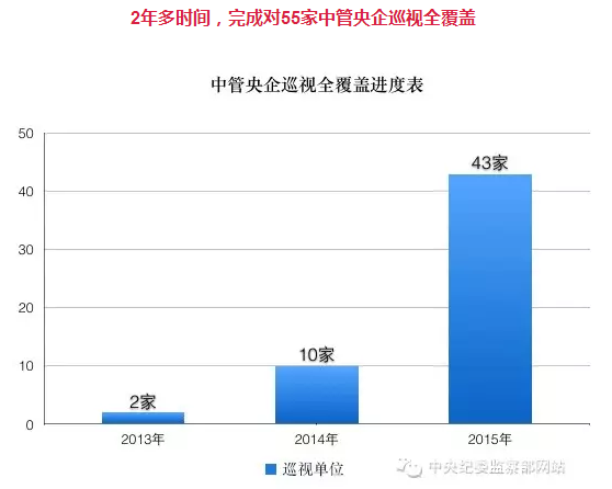 十八大以来,根据中央部署,中央巡视组通过对央企巡视试点到全面推开,用两年多时间完成了对中管央企的巡视全覆盖。数据显示,巡视央企频率加快,力度加大,其中,2013年巡视2户央企,2014年巡视10户,2015年巡视43户。同时,进一步创新方式,其中很重要的一点,就是探索开展了“一托二”的分类专项巡视,今年巡视43户央企采用的都是该方式,这大大提高了工作效率,对完成中管央企巡视全覆盖发挥了重要作用。