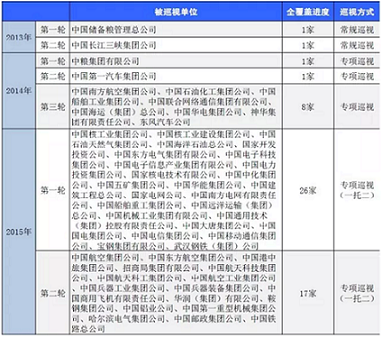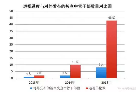 2014年发布的被查中管企业领导2人,2015年增至8人。这其中有一个重要原因,2015年巡视中管央企43家,占全部中管央企的72%。