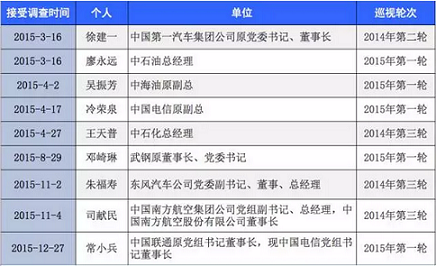 2015年接受调查的9位央企高管,其中6位所在企业于2015年接受巡视,分别为中石油总经理廖永远,中海油原副总吴振芳,中石化总经理王天普,武钢原董事长、党委书记邓崎琳,中国电信原副总冷荣泉,中国电信党组书记、董事长常小兵。另外3位所在企业也与此前被巡视。