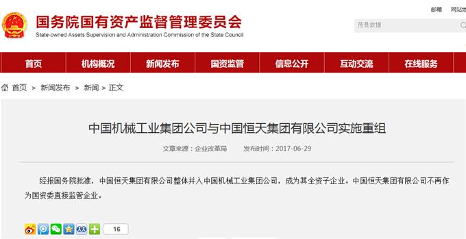 国资委官网今日发布,经报国务院批准,中国恒天集团有限公司整体并入中国机械工业集团公司,成为其全资子企业。中国恒天集团有限公司不再作为国资委直接监管企业。