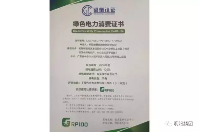 作为行业领军企业,明阳智慧能源集团承诺以中山总部明阳工业园为购买范围,并基于范围内实际产生的电力消费量,在首批自愿认购绿证交易中申请购买总计超过1200万千瓦时绿证,以实现2016年明阳工业园100%绿色电力消费。明阳智慧能源集团获得了水电水力规划设计总院颁发的“首批绿证自愿认购荣誉证书”和鉴衡认证中心颁发的“绿色电力消费证书”,成为首批绿证自愿认购单位,同时也是全国首批申请购买绿证数量最大的单位。