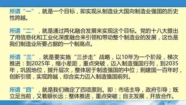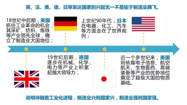 苗圩指出,无论从世界工业革命历史,还是中国工业化进程实践看,制造业都是实体经济的主体、技术创新的主战场、人才的主要聚集领域,是支撑经济社会发展的重要力量。他列举了18世纪中叶工业革命以来世界主要发达国家崛起的实例,并通过对比分析旧中国、新中国成立后30年、改革开放以来不同历史时期,中国工业经历的一穷二白、从无到有、从小到大的发展变化,阐述了“制造业兴则国家兴,制造业强则国家强”的观点。他指出,在看到制造业快速发展的同时,也要清醒地认识到,我国制造业大而不强,与世界主要制造强国相比存在较大差距的客观现实