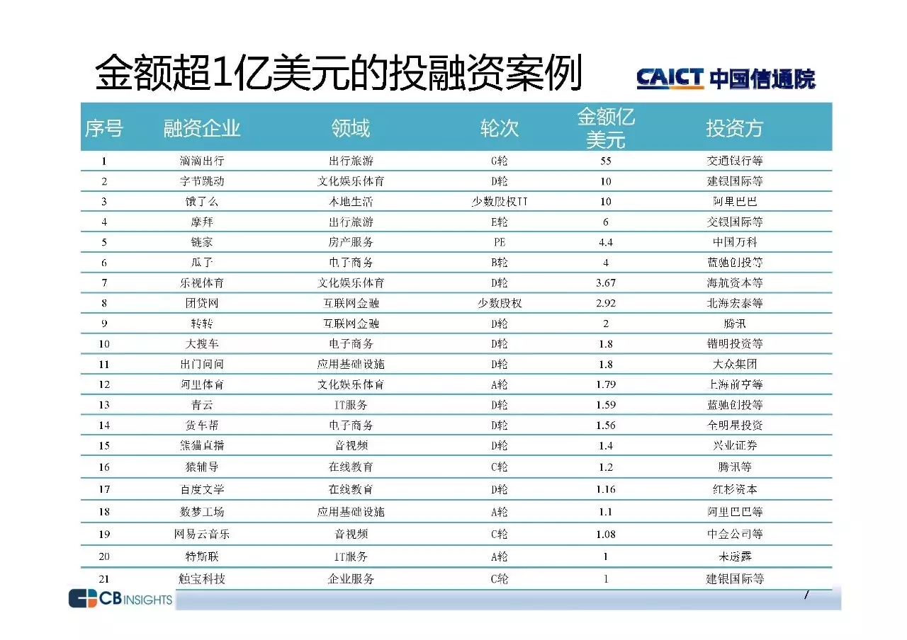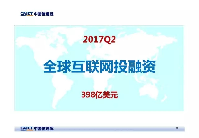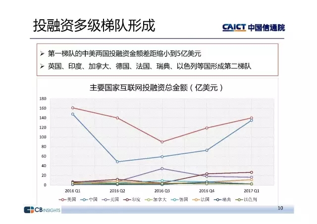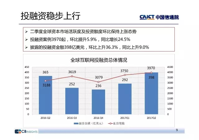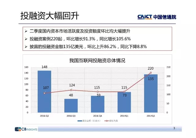 中国信息通信研究院政策与经济研究所互联网运行分析团队发布了《2017年二季度互联网投融资运行情况》报告。报告构建了互联网行业投融资研究框架,借助CB Insights的数据库,深入挖掘我国和全球行业投融资整体态势及重点领域情况,为行业趋势预测、热点问题预判提供重要参考。
