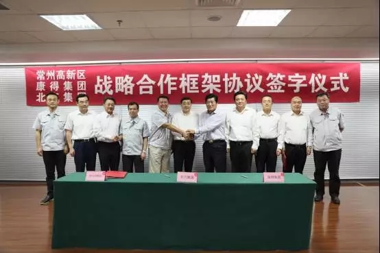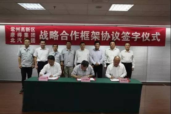 7月10日下午,康得集团携手北汽集团与常州市高新区管委会在北京签订协议,三方将共同出资,在常州国家高新技术产业开发区建设“工业4.0智能化碳纤维车体及部件工厂”,从事碳纤维新能源汽车车身零部件研发、生产及销售。常州市委书记费高云、统战部部长韩九云,北汽集团董事长徐和谊、总经理张夕勇,康得、康得新集团董事长钟玉、康得集团副总裁李响、康得集团总裁助理兼碳纤维事业部总经理张保平应邀出席。出席活动的还有常州市国家高新区党工委书记周斌、副市长兼武进区委书记史志军、金坛区委书记狄志强、新北区副区长胥亚伟,北汽集团新能源公司总经理郑刚、战略规划总监魏刚,康得集团总裁助理张继锋等。