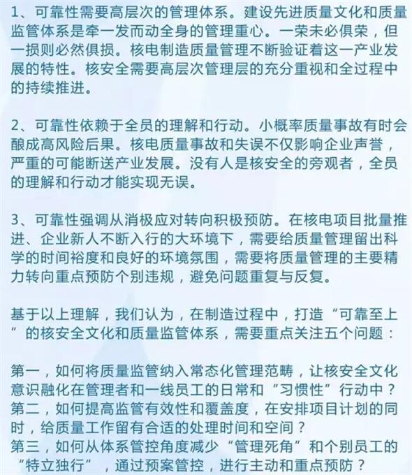 黄迪南在报告中分享了我国核工业发展的经验。他说,中国核电企业长期以来安全运行的经验,以及在核安全上保持的良好历史纪录,已成为中国核电走向国外的重要优势。这些年来,在推进和完善制造体系,不断扩大国产化供货业绩的过程中,核电制造“以质取胜”的理念进一步弘扬,对“可靠至上”的核安全文化认识也在不断加深。但在核电项目批量推进、企业新人不断入行的大环境下,需要给质量管理留出科学的时间裕度和良好的环境氛围,需要将质量管理的主要精力转向重点预防个别违规,避免问题重复与反复。