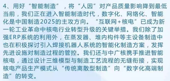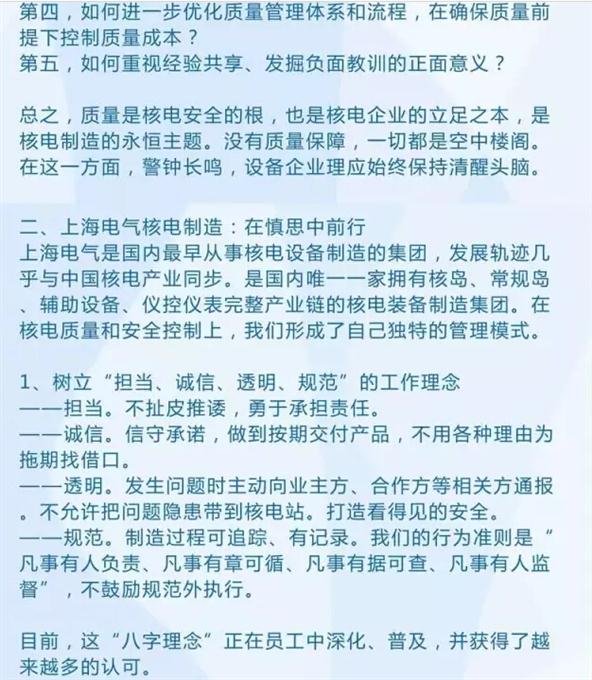 黄迪南介绍说,上海电气是国内最早从事核电设备制造的集团,发展轨迹几乎与中国核电产业同步,是国内唯一一家拥有核岛、常规岛、辅助设备、仪控仪表完整产业链的核电装备制造集团。在核电质量和安全控制上,已形成了自己独特的管理模式。在核电质量和安全控制上,树立了“担当、诚信、透明、规范”的工作理念。以“一体化”建设推动专业化运作,推动资源整合利用和质量管理体系的优化,最终带动上海电气核电产业竞争优势和核安全文化的全面提升,不断提高企业质保体系的适用性和有效性,用好“智能制造”,将“人因”对产品质量影响降到最低。