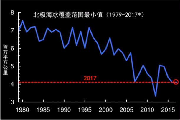 伴随着全球气候变化,北极海冰发生了显著的变化。从1979年至今,北极海冰覆盖范围逐年减少。每年九月的海冰覆盖范围为全年最小,过去几十年减少了近50%。