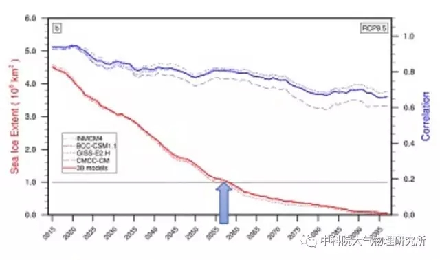 预测北极夏季无冰时间,摘自 Liu et al., 2013