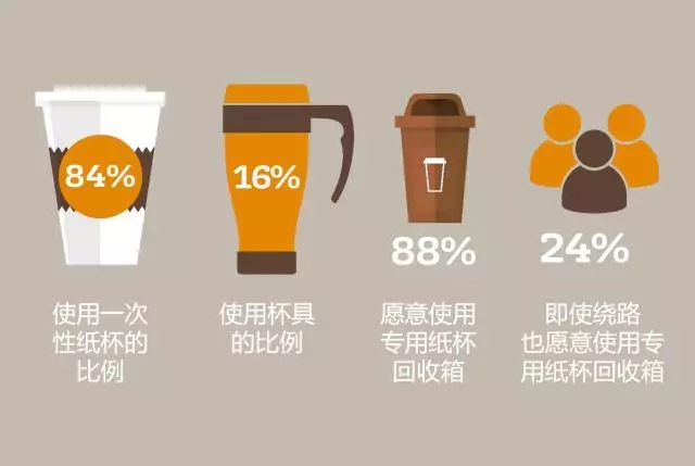 在英国,84%的热饮消费者仍然偏好使用一次性咖啡杯。而在这些消费者中,88%的人如果看到有咖啡杯专用的回收箱,愿意将咖啡杯投入其中。47%为了将咖啡杯投入专用回收箱,愿意捧着杯子多走一段路,甚至有24%愿意在不顺路的情况下绕路而为之。