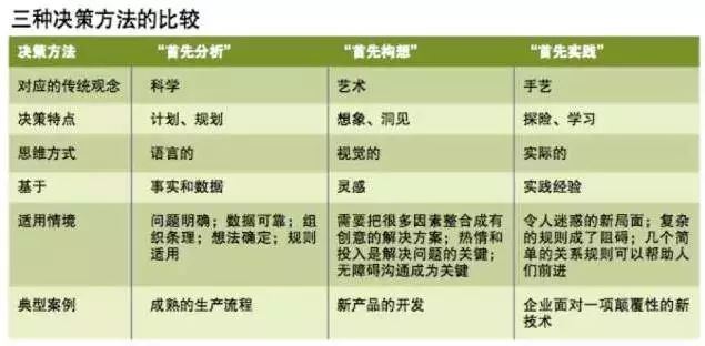 l “首先分析”适合于问题清晰、数据可靠、组织条例的情况;就像在成熟的生产流程中,想法都已确定,规则都可以推行无碍的情况下那样。当需要把很多因素整合成有创意的解决方案,当热情和投入是解决问题的关键时,就像很多新产品的开发过程。