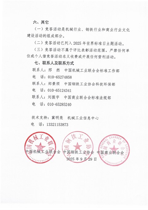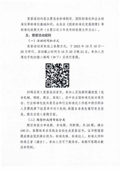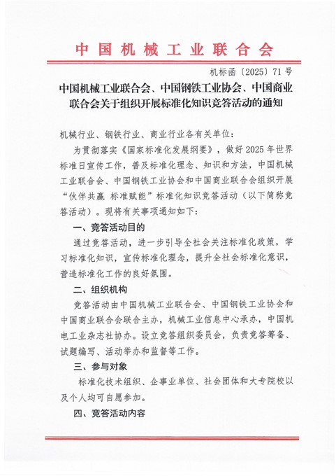 为贯彻落实《国家标准化发展纲要》,做好2025年世界标准日宣传工作,普及标准化理念、知识和方法,中国机械工业联合会、中国钢铁工业协会和中国商业联合会组织开展“伙伴共赢 标准赋能”标准化知识竞答活动(以下简称竞答活动)。现将有关事项通知如下:
