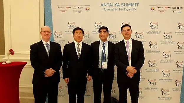 B20峰会是G20重要配套活动,G20成员领导人和工商界代表就B20政策建议报告有关内容进行对话讨论。本届会议上,土耳其正式向中国交接了2016年B20主办权。而据2016年B20组委会发出的邀请,任洪斌董事长将担任2016年B20基础设施工作组主席。