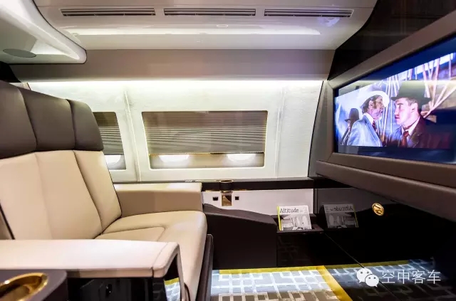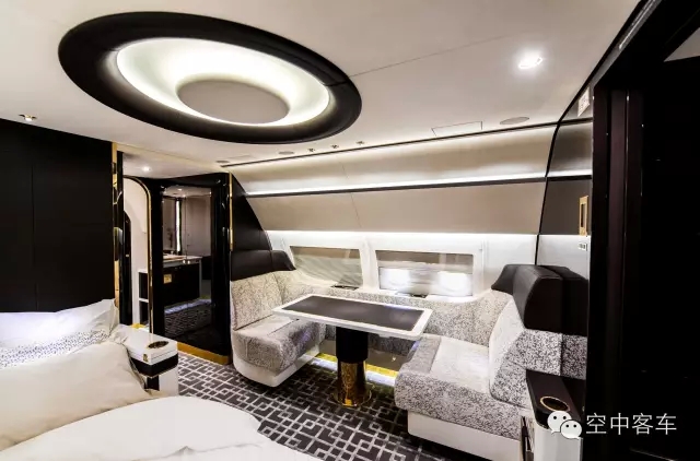 这架ACJ319的客舱还设有一个机组休息区,一个能容纳两名乘客的迷你影院和一个带独立浴室的主卧室。所有这些区域都包含创新性的模块化设计——比如主卧中的双人沙发就可以转换为一张拥有两个VIP席位的矮桌。