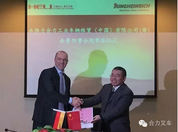 岁末年终,在西方的圣诞节和2016年元旦新年到来之际,中国安徽合力与德国永恒力同时对外公告,双方拟共同出资2亿元人民币,各占50%股份,在中国上海成立中德合资“永恒力合力工业车辆租赁(中国)有限公司”,致力于在中国开展全系列电动及内燃工业车辆租赁业务,充分发挥双方的品牌、产品和网络、服务优势,实现优势互补与资源共享,为中国市场和客户提供全系列、一揽子运搬设备和物流解决方案租赁服务。