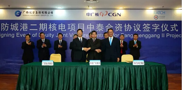 12月23日,中国广核集团与广西投资集团有限公司、泰国国家电力公司子公司RATCH在广西南宁正式签署了《防城港核电二期项目合资协议》。根据协议,三方将在中泰两国政府间和平利用核能协议的基础上,合资成立防城港核电二期项目公司,共同开发、建设和运营该项目。