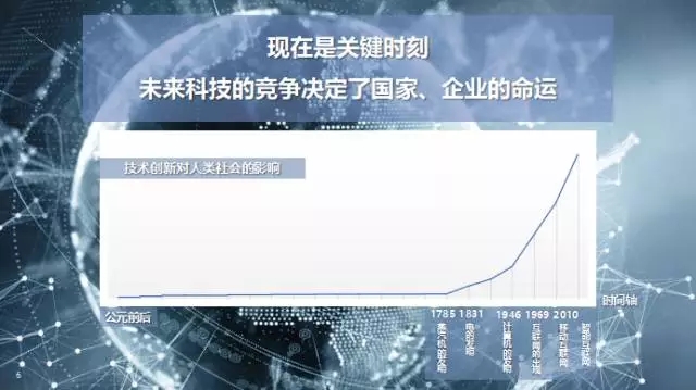 人类社会在近200年以来,在这以前整个科技的未来社会的影响,几乎是一条平线,而且很低很低,到了蒸汽机的发现开始变成一个抛物线,向上走,拐点最快的地方,应该讲是在计算机,特别是PC出现以后开始产生剧烈的拐点,大弧度向上。为什么我要特别说明PC呢?因为第一,PC确实是今天互联网、人工智能发展的一个基础;第二,从PC开始中国逐渐居于领先地位;第三,联想在这方面有贡献,我得给自己做个广告。