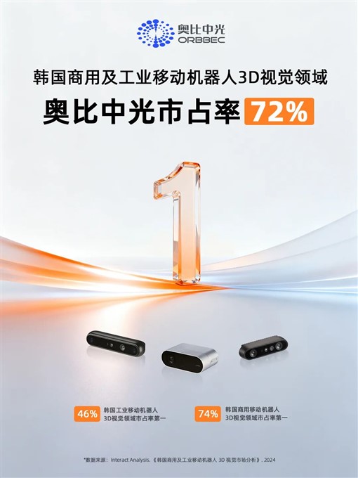 根据2024年机器人出货量和3D相机配套数量统计,奥比中光在韩国商用和工业移动机器人3D视觉市场中排名第一,市场份额达到约72%。