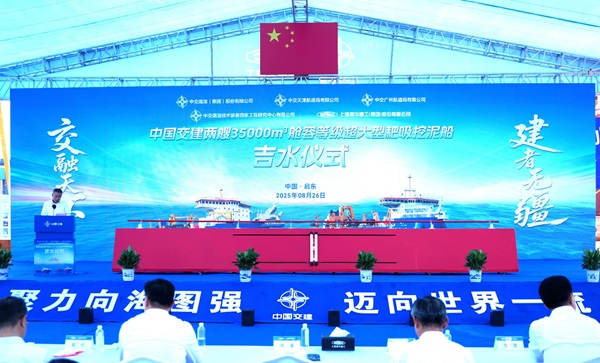 8月26日,我国自主研发设计建造的两艘35000立方米舱容等级超大型耙吸挖泥船“通浚”轮和“浚广”轮在江苏启东顺利吉水。中交集团党委常委、副总经理陈重出席吉水仪式并致辞。