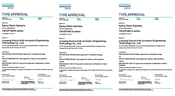 厦门双瑞风电叶片用环氧树脂系列产品获得挪威船级社(DNV)型式认可证书