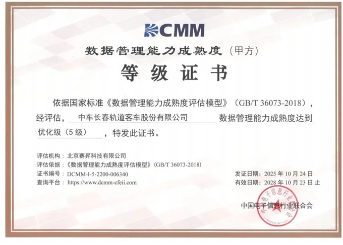 近日,中国中车集团旗下中车长客股份公司正式通过国家《数据管理能力成熟度评估模型》(DCMM)最高等级——优化级(五级)认证,成为轨道交通行业首家获此殊荣的企业,标志着中车在数据管理能力上达到国内先进水平。DCMM是我国数...