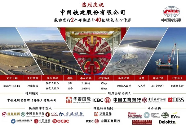 11月4日,中国铁建成功发行双年期40亿元离岸人民币绿色债券,本期债券由穆迪授予债项评级A3,绿色发展质量分数SQS2(优秀),票面利率5年期2.18%,10年期2.6%,是公司首次在境外发行10年期绿色债券。