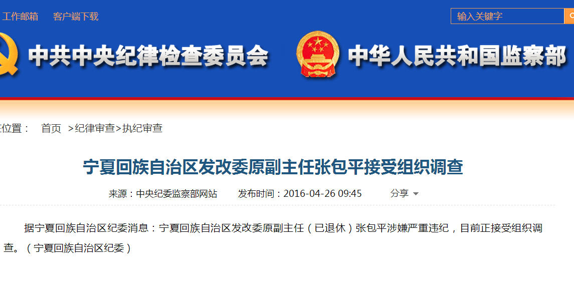 中央纪委监察部网站4月26日09:45消息,据宁夏回族自治区纪委消息:宁夏回族自治区发改委原副主任(已退休)张包平涉嫌严重违纪,目前正接受组织调查。