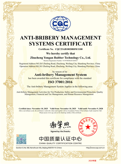 近日,赛轮集团旗下诸城涌安橡胶科技有限公司(以下简称 “潍坊工厂”)正式获颁中国质量认证中心ISO 37001 反贿赂管理体系认证证书。该认证标志着潍坊工厂在反贿赂管理体系建设方面已达到国际先进标准,在廉洁合规治理与风...