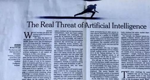 日前,创新工场创始人兼CEO、人工智能工程院院长李开复博士在纽约时报(The New York Times)的“观点”(Opinion)栏目发表专栏文章《人工智能对人类社会的真正威胁》(The Real Threats of Artificial Intelligence)。br/>在...